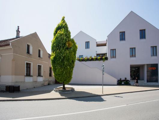 Rekonstruovaný supermarket COOP v Lednici s drážkovanou fasádou StoSignature Linear