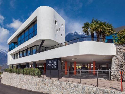 Černá a bílá na fasádě rodinného hotelu nedaleko Merana